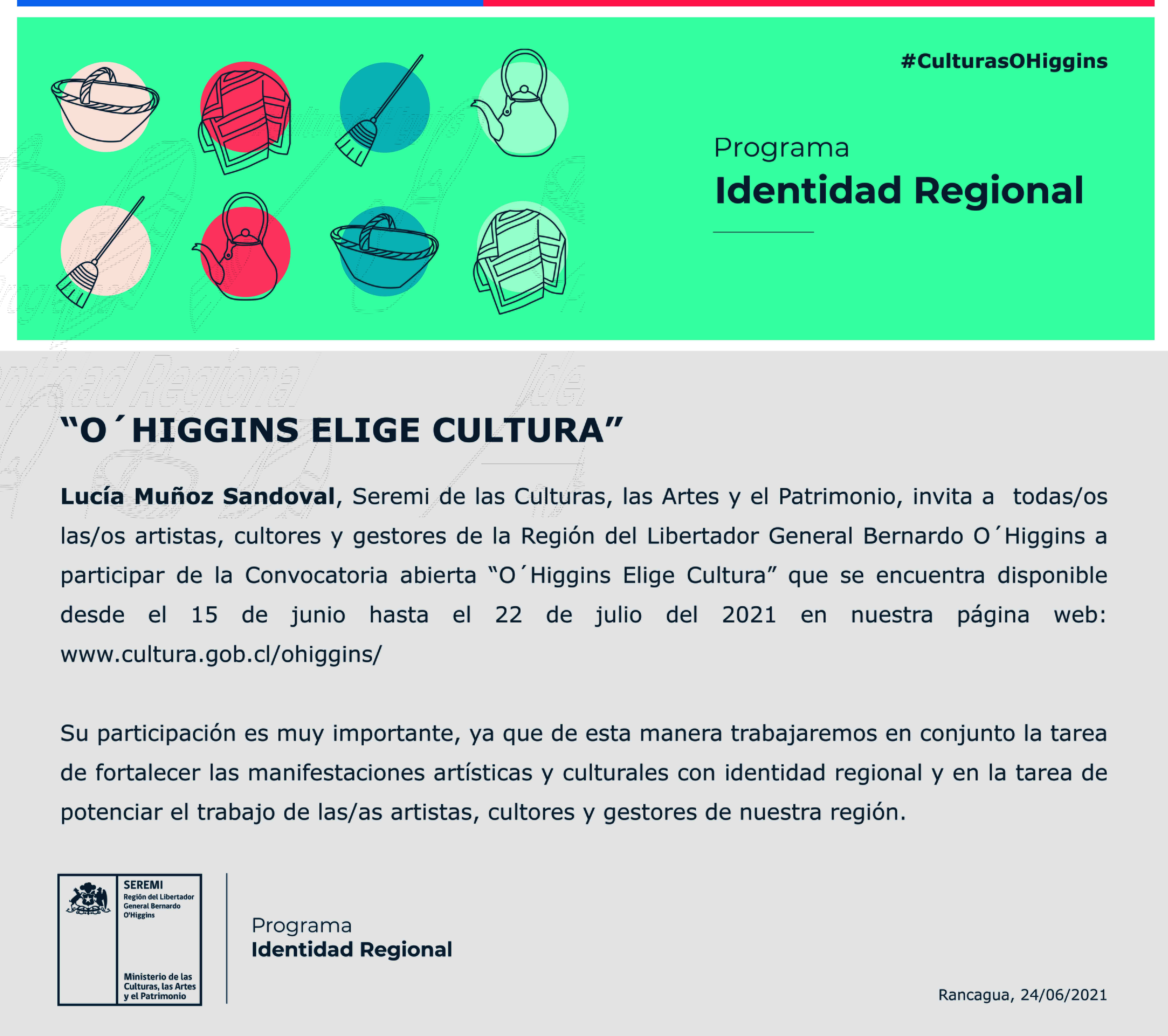 ¡Atención Comunidad Antilen a la siguiente invitación! El plazo de postulación es hasta el 22 de julio del presente año. En la página www.cultura.gob.cl/ohiggins podrás