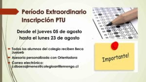 Inscripción y rendición PTU . ¡¡Atención alumnos de IV medio a esta importante información acerca de las fechas de inscripción y rendición de PTU!! ¿Tienes dudas ó consultas? Contáctate Leer Más » 2 de agosto de 2021