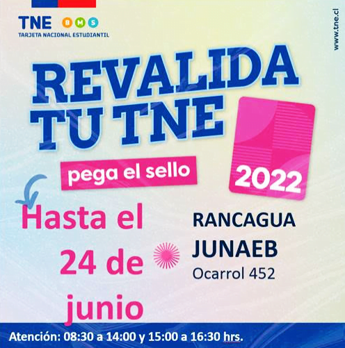 JUNAEB informa que el proceso de revalidación de la Tarjeta Nacional Estudiantil TNE con sello 2022, se realizará hasta el viernes 24 de junio, en el módulo provincial ubicado en calle O’Carrol 452, Rancagua.